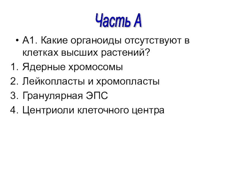 Слайд 2А1. Какие органоиды отсутствуют в клетках высших растений?