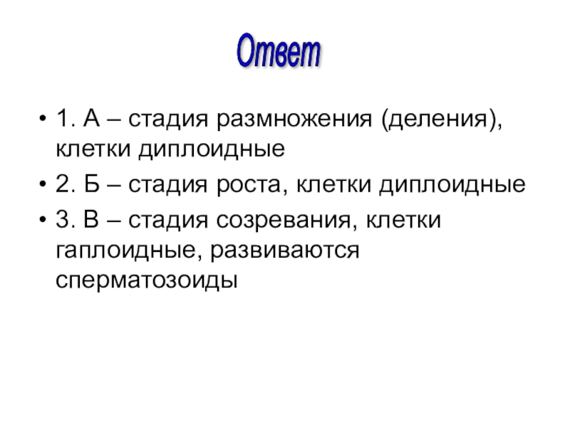 3. В – стадия созревания, клетки гаплоидные, развиваются сперматозоиды