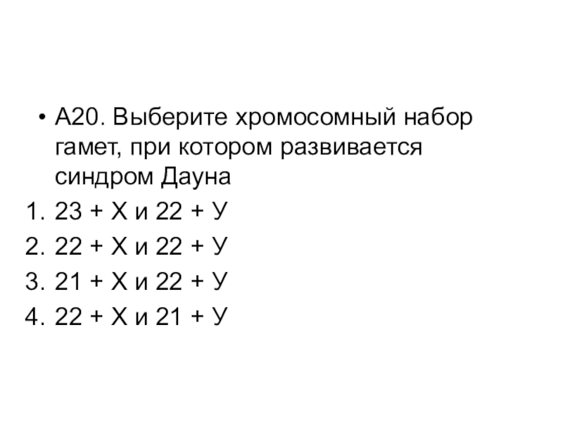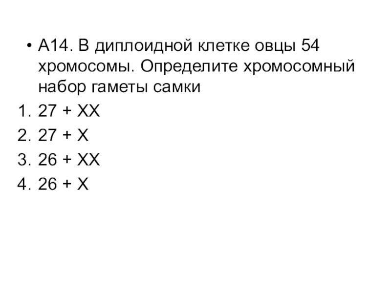 Слайд 15А14. В диплоидной клетке овцы 54 хромосомы. Определите хромосомный набор гаметы