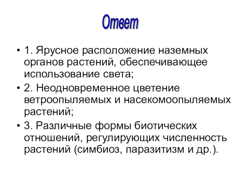 Слайд 511. Ярусное расположение наземных органов растений, обеспечивающее использование света;