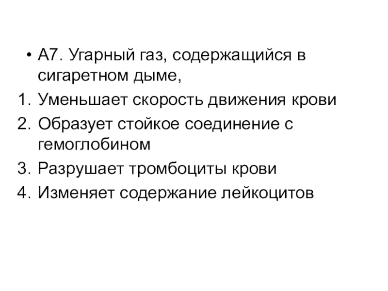 Слайд 8А7. Угарный газ, содержащийся в сигаретном дыме,