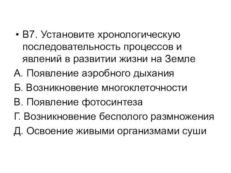 Слайд 28В7. Установите хронологическую последовательность процессов и явлений в развитии жизни на