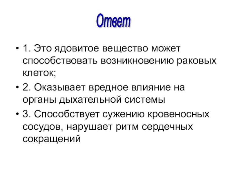 Слайд 421. Это ядовитое вещество может способствовать возникновению раковых клеток;