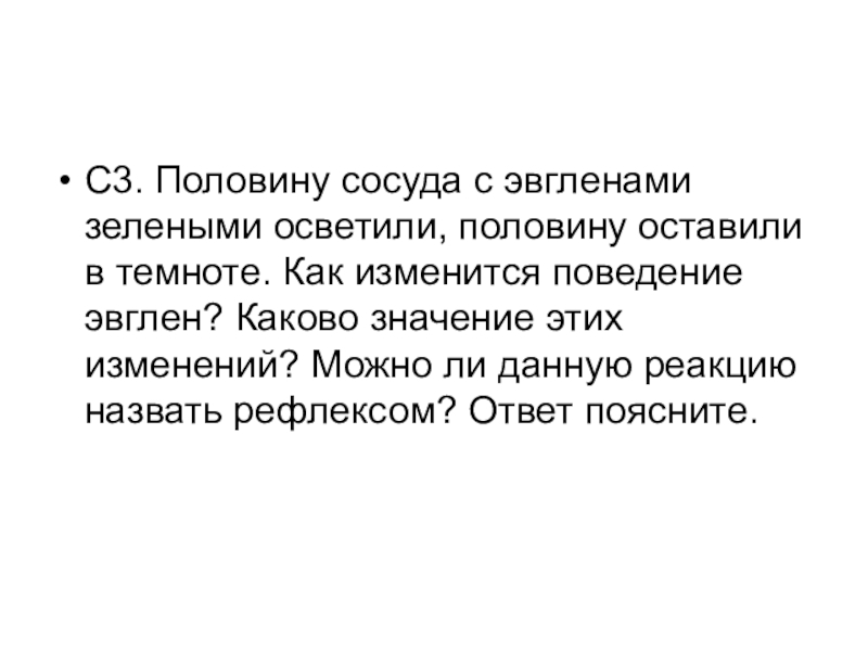 Слайд 31С3. Половину сосуда с эвгленами зелеными осветили, половину оставили в темноте.