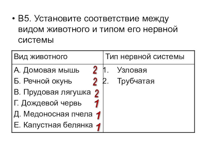 Слайд 26В5. Установите соответствие между видом животного и типом его нервной системы