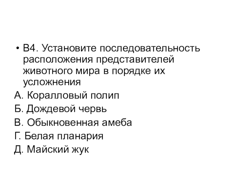 Слайд 25В4. Установите последовательность расположения представителей животного мира в порядке их усложнения
