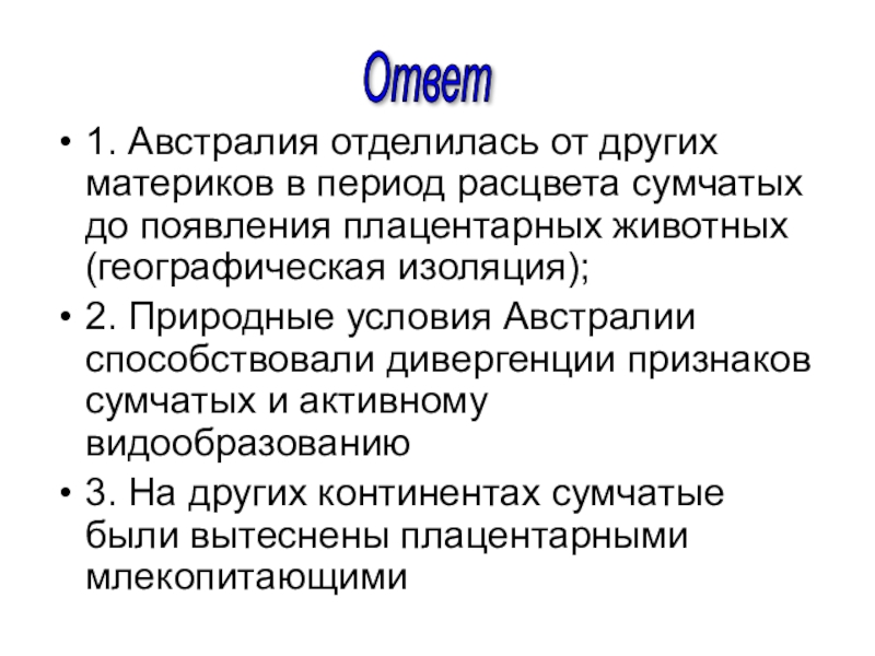 Слайд 381. Австралия отделилась от других материков в период расцвета сумчатых до
