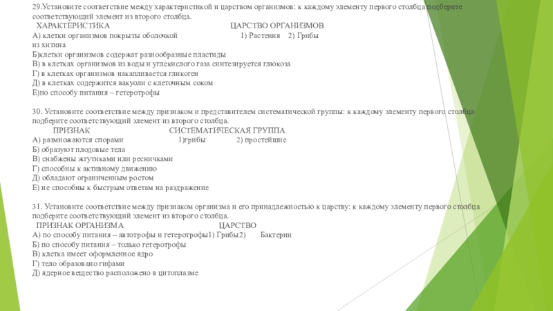 31. Установите соответствие между признаком организма и его принадлежностью к царству: к каждому элементу первого столбца подберите соответствующий элемент из второго столбца.