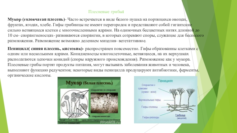 портящихся овощах, фруктах, ягодах, хлебе. Гифы грибницы не имеют перегородок и представляют собой гигантские сильно ветвящиеся клетки с многочисленными ядрами. На одиночных бесцветных нитях длинной до 10 см- спорангиеносцах- развиваются спорангии, в которых созревают споры, служащие для бесполого размножения. Размножение возможно делением мицелия- вегетаттивное.