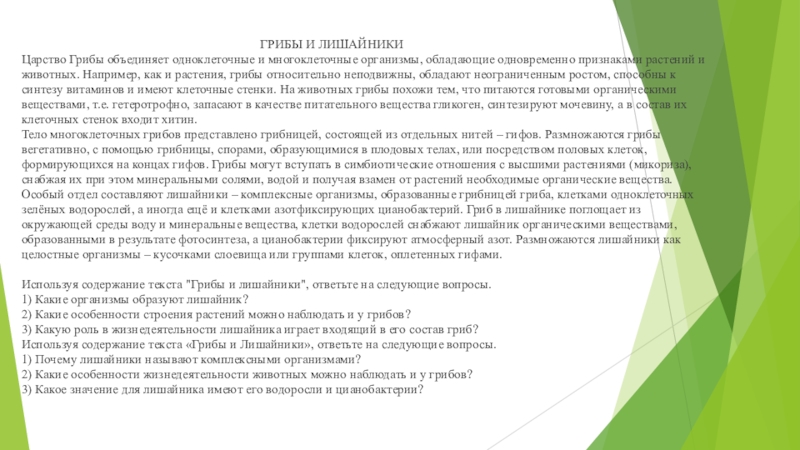 Используя содержание текста "Грибы и лишайники", ответьте на следующие вопросы.