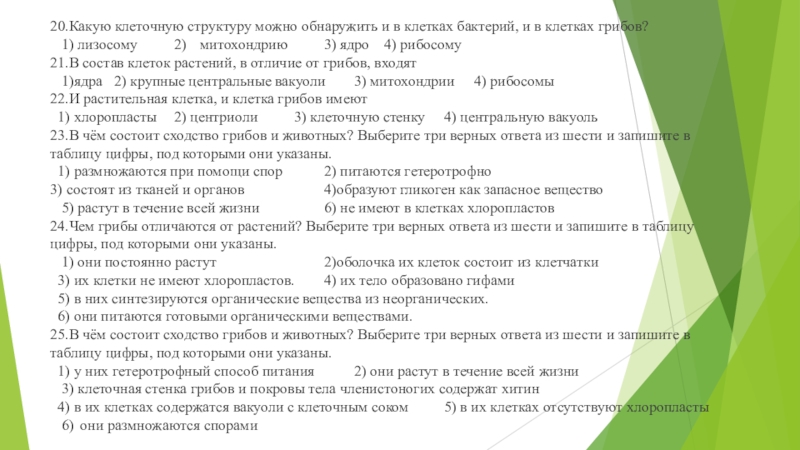24.Чем грибы отличаются от растений? Выберите три верных ответа из шести и запишите в таблицу цифры, под которыми они указаны.