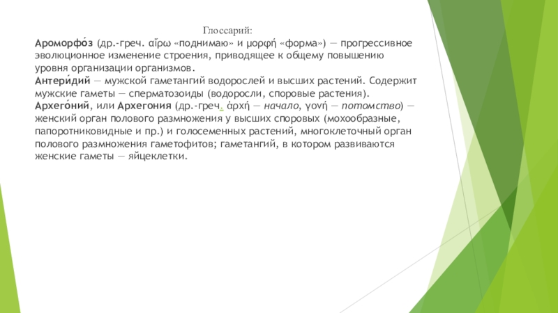 Основные ароморфозы: 1. Многоклеточность, 2. Антеридии и архегонии, 3.Половое размножение