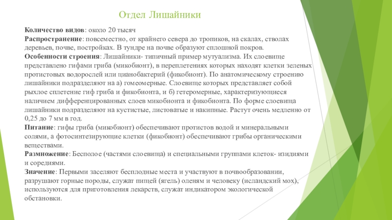 Значение: Первыми заселяют бесплодные места и участвуют в почвообразовании, разрушают горные породы, служат пищей (ягель) оленям и человеку (исландский мох), используются для приготовления лекарств, служат индикатором экологической обстановки.