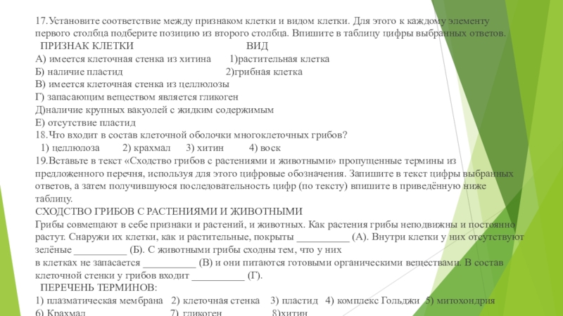 Слайд 1317.Установите соответствие между признаком клетки и видом клетки. Для этого к