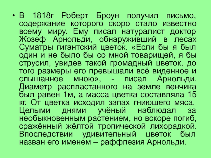 всему миру. Ему писал натуралист доктор Жозеф Арнольди, обнаруживший в лесах Суматры гигантский цветок. «Если бы я был один и не было бы со мной товарищей, я бы струсил, увидев такой громадный цветок, до того размеры его превышали всё виденное и слышанное мною», - писал Арнольди. Диаметр распластанного на земле венчика был равен 1м, а масса цветка составляла 15 кг. От цветка исходил запах гниющего мяса. Целыми днями учёный наблюдал за необыкновенным растением, но вскоре погиб, сражённый жёлтой тропической лихорадкой. Впоследствии удивительный цветок был назван его именем – раффлезия Арнольди.