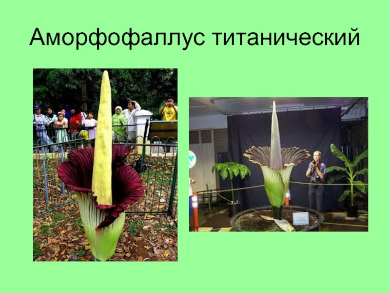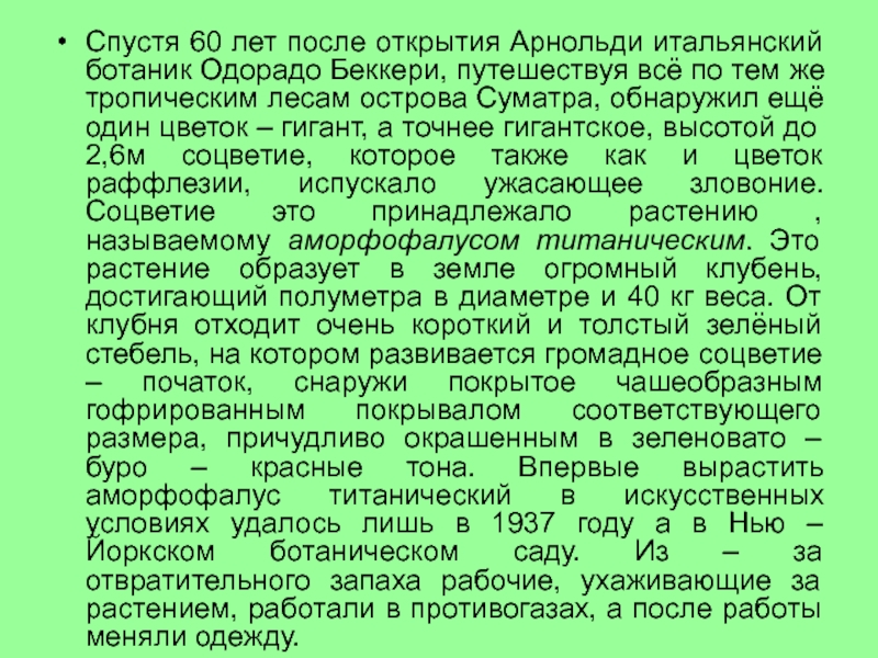 всё по тем же тропическим лесам острова Суматра, обнаружил ещё один цветок – гигант, а точнее гигантское, высотой до 2,6м соцветие, которое также как и цветок раффлезии, испускало ужасающее зловоние. Соцветие это принадлежало растению , называемому аморфофалусом титаническим. Это растение образует в земле огромный клубень, достигающий полуметра в диаметре и 40 кг веса. От клубня отходит очень короткий и толстый зелёный стебель, на котором развивается громадное соцветие – початок, снаружи покрытое чашеобразным гофрированным покрывалом соответствующего размера, причудливо окрашенным в зеленовато – буро – красные тона. Впервые вырастить аморфофалус титанический в искусственных условиях удалось лишь в 1937 году а в Нью – Йоркском ботаническом саду. Из – за отвратительного запаха рабочие, ухаживающие за растением, работали в противогазах, а после работы меняли одежду.