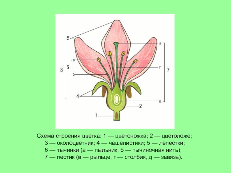 Слайд 4Схема строения цветка: 1 — цветоножка; 2 — цветоложе;