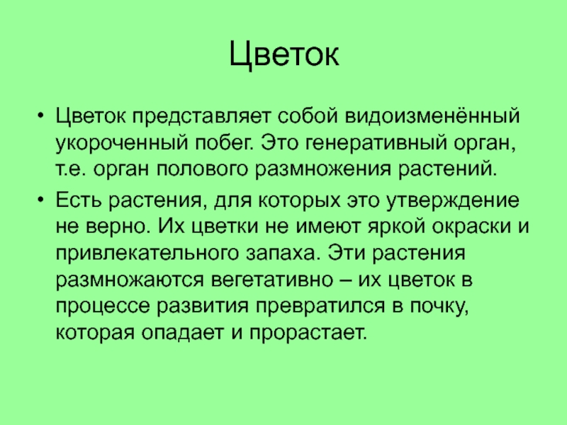 ЦветокЦветок представляет собой видоизменённый укороченный побег. Это генеративный орган, т.е. орган полового размножения растений.Есть растения, для которых