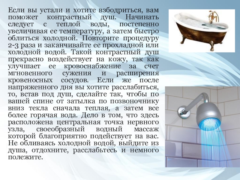 Слайд 18Если вы устали и хотите взбодриться, вам поможет контрастный душ. Начинать