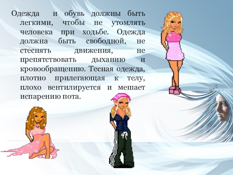 Слайд 25Одежда и обувь должны быть легкими, чтобы не утомлять человека при