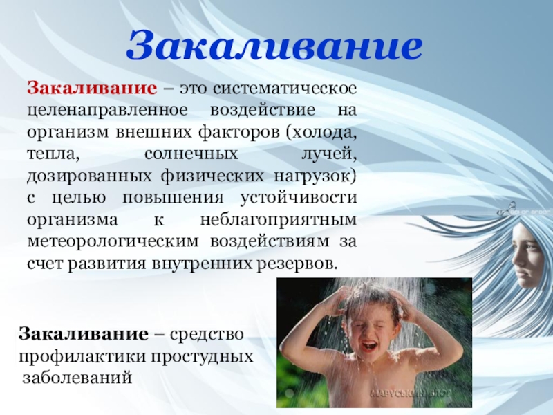 Слайд 5Закаливание – это систематическое целенаправленное воздействие на организм внешних факторов (холода,