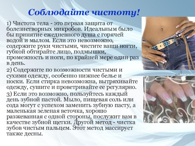 Слайд 301) Чистота тела - это первая защита от болезнетворных микробов. Идеальным