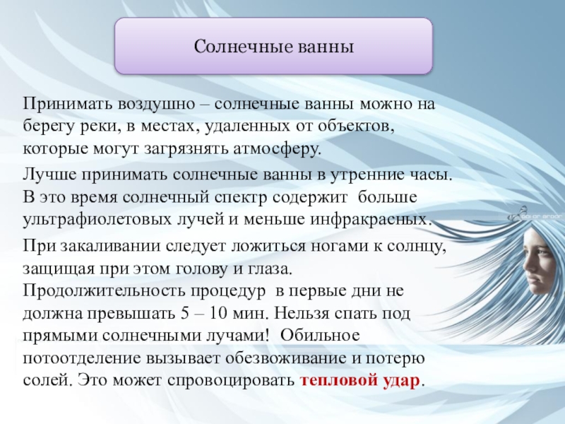 солнцем может привести к тяжелым последствиям! Нельзя доводить себя до обильного потения и спать во время принятия воздушно – солнечных ванн.