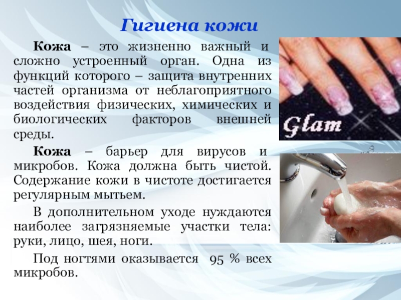 Кожа – барьер для вирусов и микробов. Кожа должна быть чистой. Содержание кожи в чистоте достигается регулярным мытьем.