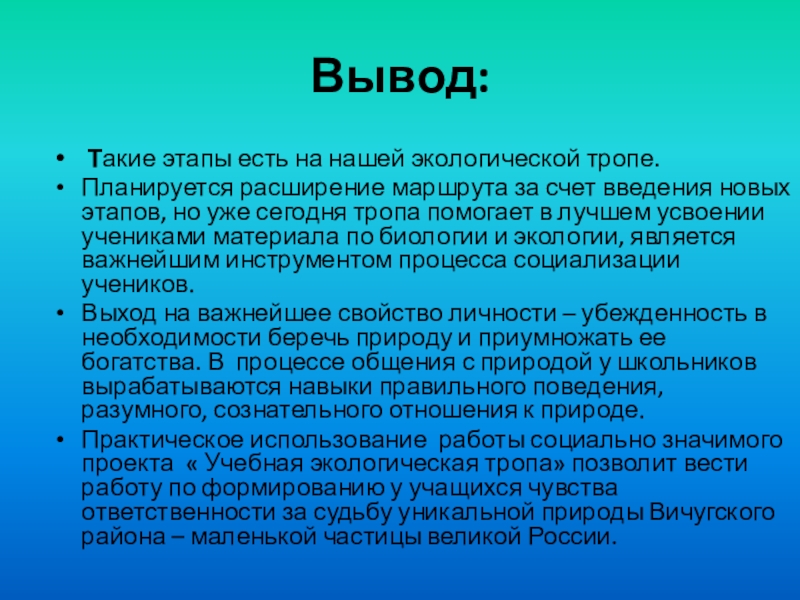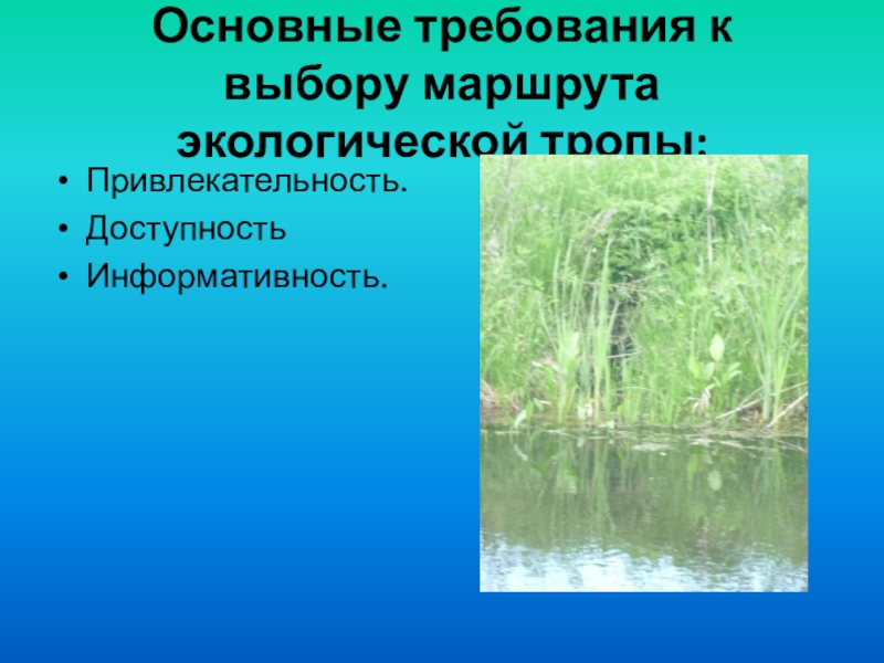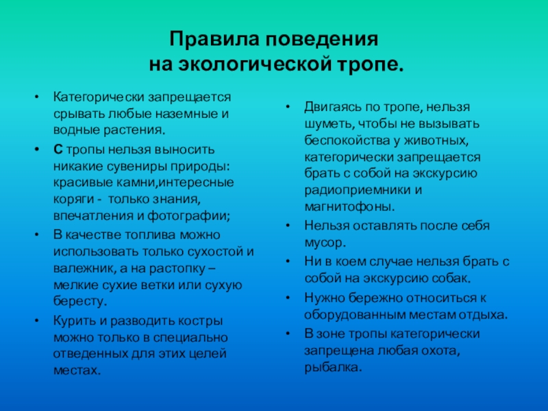 Двигаясь по тропе, нельзя шуметь, чтобы не вызывать беспокойства у животных, категорически запрещается брать с собой на экскурсию радиоприемники и магнитофоны.