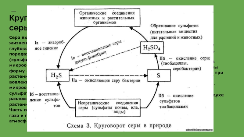 В результате деятельности человека круговорот многих элементов резко ускоряется, при этом в одних местах возникает их недостаток, а в других – избыток. Оксид серы (SО2) попадает в атмосферу при сжигании угля и нефти с высоким содержанием серы. Рядом с медеплавильными заводами избыток SО2 в воздухе вызывает гибель растительности вследствие нарушения процесса фотосинтеза.