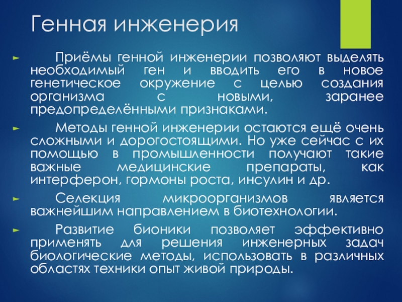 Методы генной инженерии остаются ещё очень сложными и дорогостоящими. Но уже сейчас с их помощью в промышленности получают такие важные медицинские препараты, как интерферон, гормоны роста, инсулин и др.