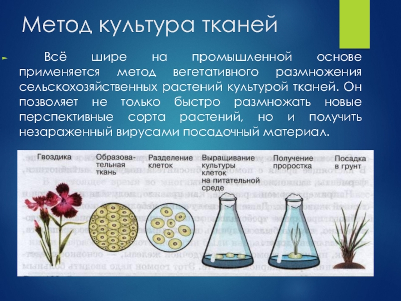 размножения сельскохозяйственных растений культурой тканей. Он позволяет не только быстро размножать новые перспективные сорта растений, но и получить незараженный вирусами посадочный материал.