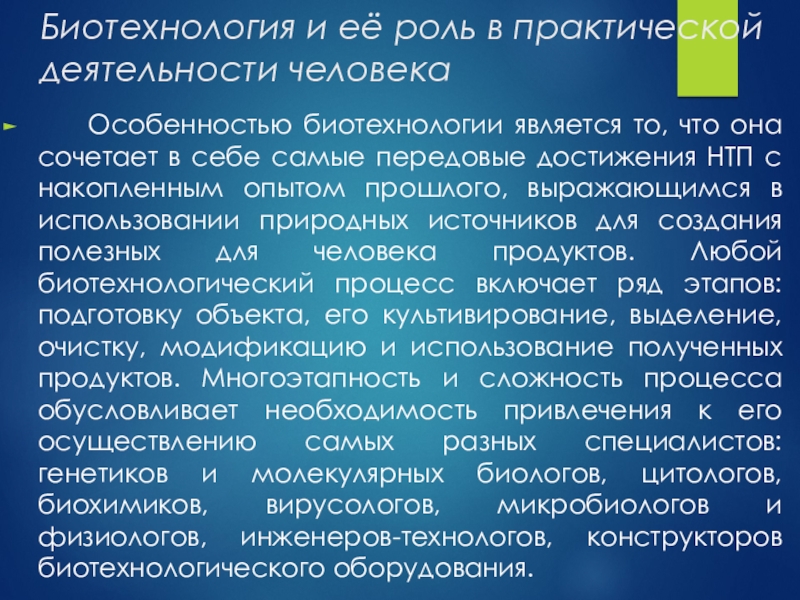 то, что она сочетает в себе самые передовые достижения НТП с накопленным опытом прошлого, выражающимся в использовании природных источников для создания полезных для человека продуктов. Любой биотехнологический процесс включает ряд этапов: подготовку объекта, его культивирование, выделение, очистку, модификацию и использование полученных продуктов. Многоэтапность и сложность процесса обусловливает необходимость привлечения к его осуществлению самых разных специалистов: генетиков и молекулярных биологов, цитологов, биохимиков, вирусологов, микробиологов и физиологов, инженеров-технологов, конструкторов биотехнологического оборудования.