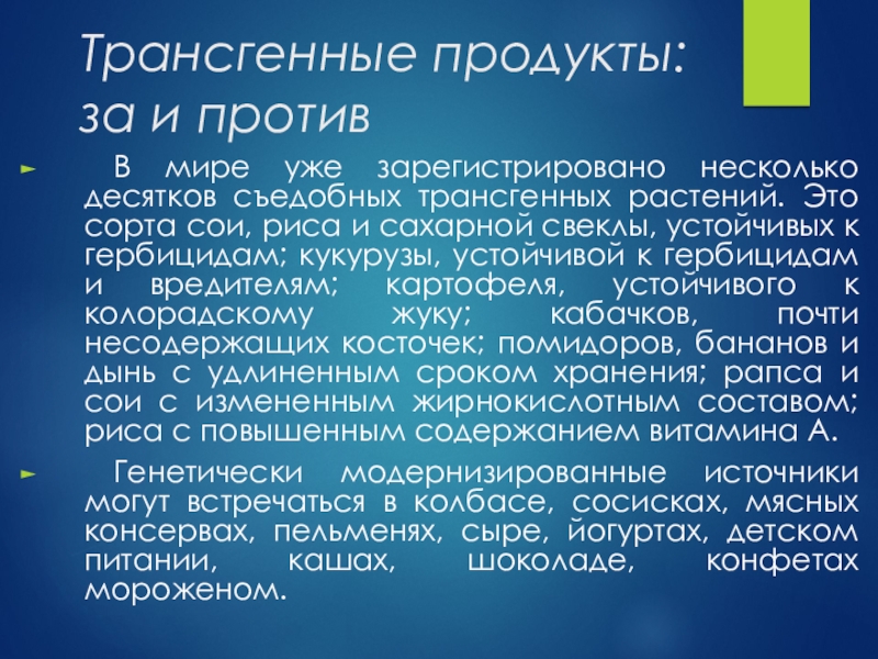 съедобных трансгенных растений. Это сорта сои, риса и сахарной свеклы, устойчивых к гербицидам; кукурузы, устойчивой к гербицидам и вредителям; картофеля, устойчивого к колорадскому жуку; кабачков, почти несодержащих косточек; помидоров, бананов и дынь с удлиненным сроком хранения; рапса и сои с измененным жирнокислотным составом; риса с повышенным содержанием витамина А.