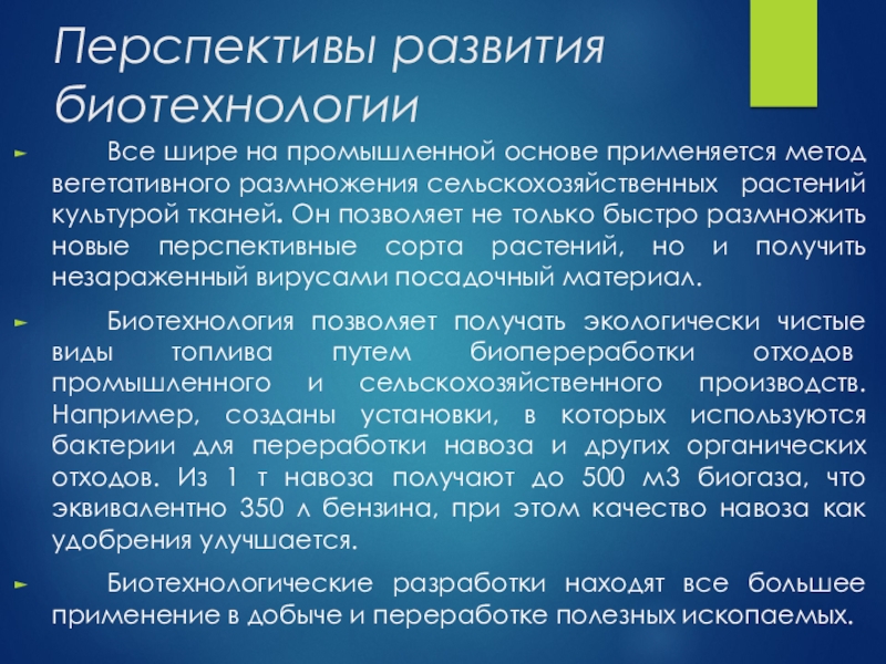 Биотехнология позволяет получать экологически чистые виды топлива путем биопереработки отходов промышленного и сельскохозяйственного производств. Например, созданы установки, в которых используются бактерии для переработки навоза и других органических отходов. Из 1 т навоза получают до 500 м3 биогаза, что эквивалентно 350 л бензина, при этом качество навоза как удобрения улучшается.