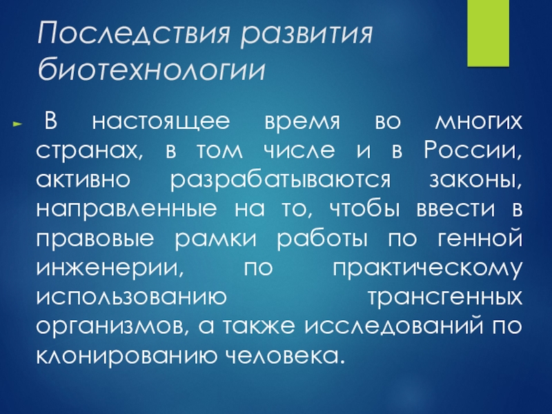 числе и в России, активно разрабатываются законы, направленные на то, чтобы ввести в правовые рамки работы по генной инженерии, по практическому использованию трансгенных организмов, а также исследований по клонированию человека.