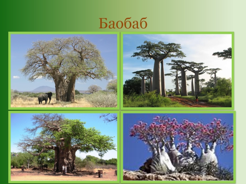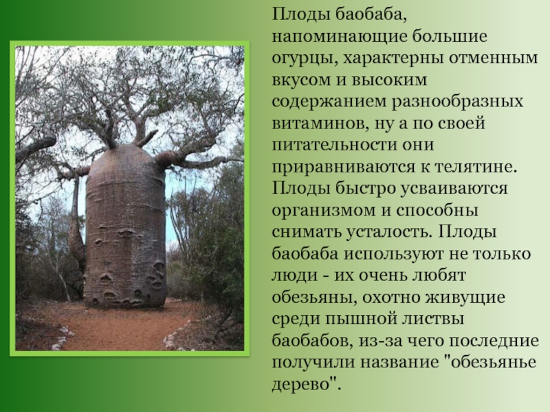 Слайд 14Плоды баобаба, напоминающие большие огурцы, характерны отменным вкусом и высоким содержанием