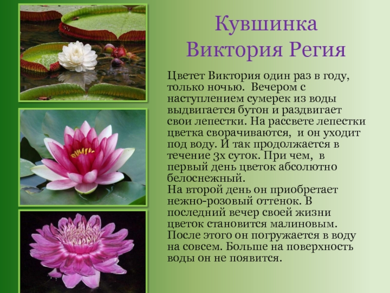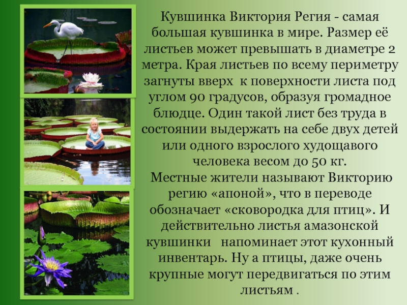 Слайд 12Кувшинка Виктория Регия - самая большая кувшинка в мире. Размер её