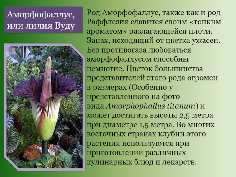 Слайд 7Род Аморфофаллус, также как и род Раффлезия славится своим «тонким ароматом»