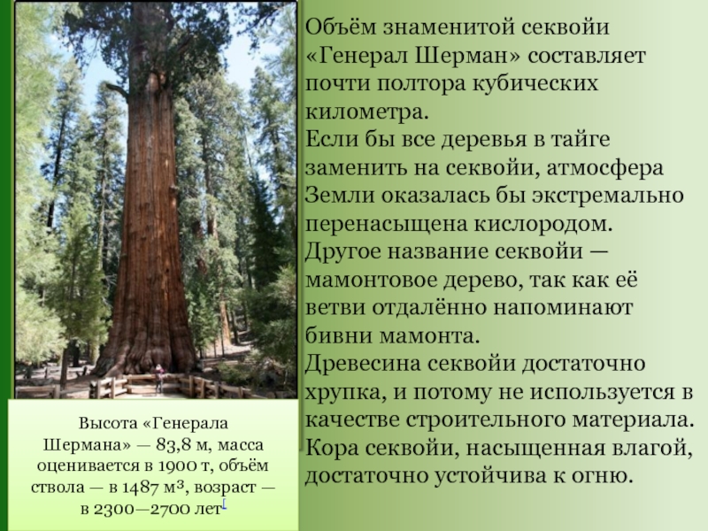 знаменитой секвойи «Генерал Шерман» составляет почти полтора кубических километра.
