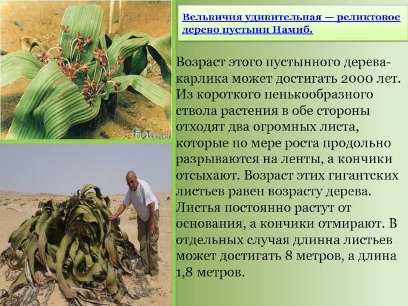 Слайд 5Возраст этого пустынного дерева-карлика может достигать 2000 лет. Из короткого пенькообразного