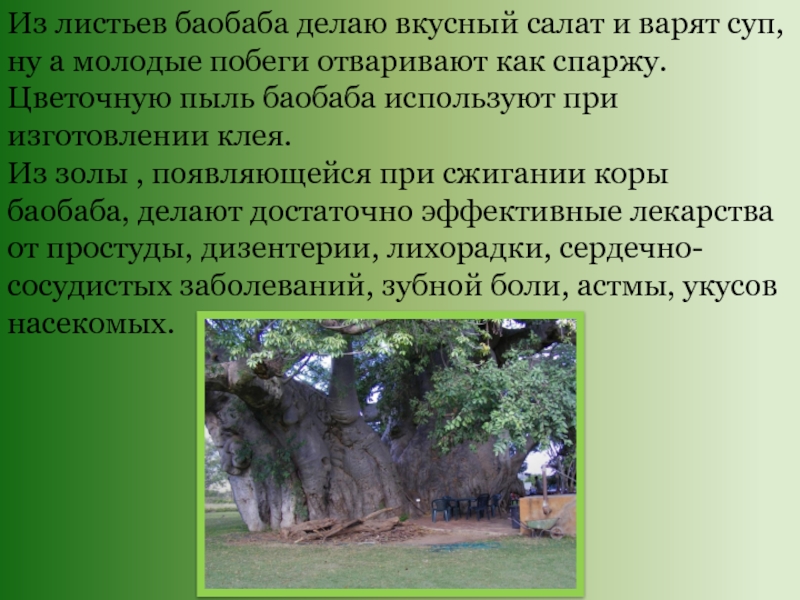 Слайд 17Из листьев баобаба делаю вкусный салат и варят суп, ну а