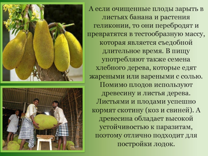 то они перебродят и превратятся в тестообразную массу, которая является съедобной длительное время. В пищу употребляют также семена хлебного дерева, которые едят жареными или вареными с солью. Помимо плодов используют древесину и листья дерева. Листьями и плодами успешно кормят скотину (коз и свиней). А древесина обладает высокой устойчивостью к паразитам, поэтому отлично подходит для постройки лодок.