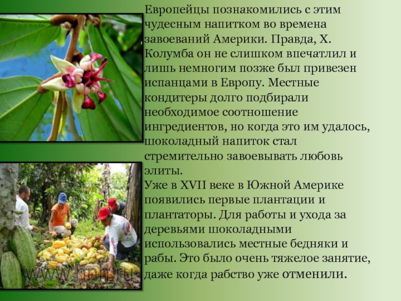 Слайд 28Европейцы познакомились с этим чудесным напитком во времена завоеваний Америки. Правда,