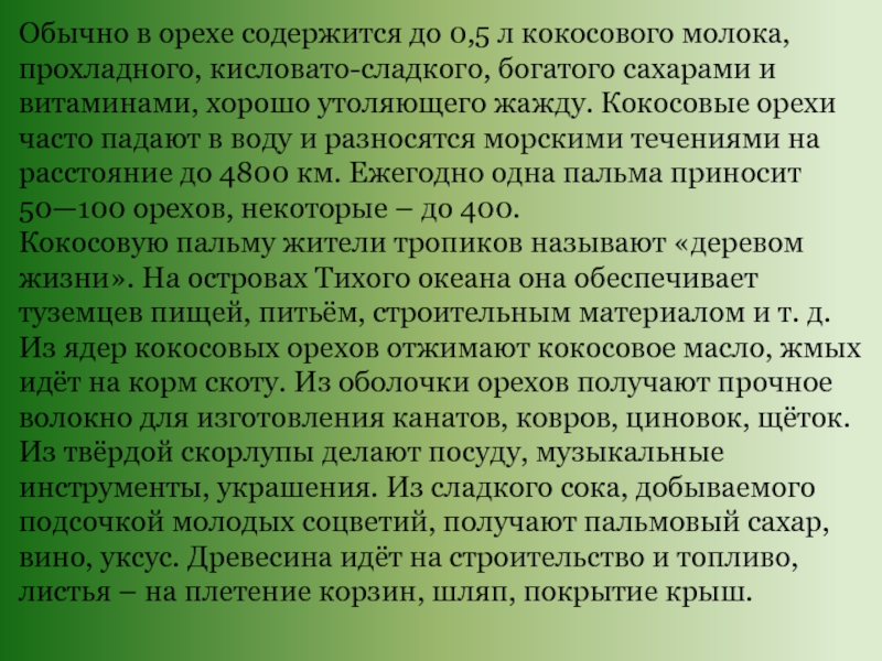 богатого сахарами и витаминами, хорошо утоляющего жажду. Кокосовые орехи часто падают в воду и разносятся морскими течениями на расстояние до 4800 км. Ежегодно одна пальма приносит 50—100 орехов, некоторые – до 400.