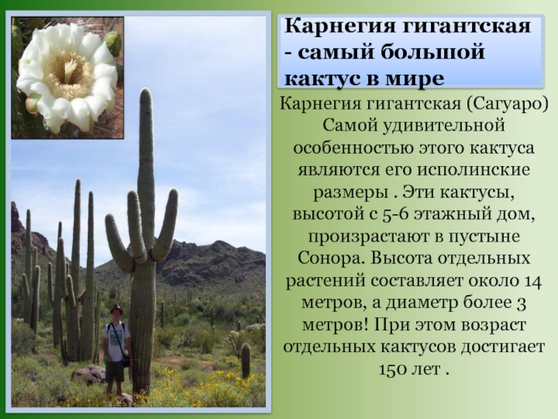 Слайд 10Карнегия гигантская (Сагуаро) Самой удивительной особенностью этого кактуса являются его исполинские