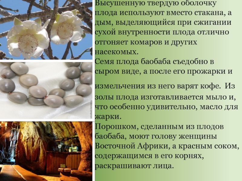 Порошком, сделанным из плодов баобаба, моют голову женщины Восточной Африки, а красным соком, содержащимся в его корнях, раскрашивают лица.