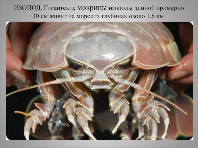 Слайд 64ИЗОПОД. Гигантские мокрицы изоподы длиной примерно 30 см живут на морских