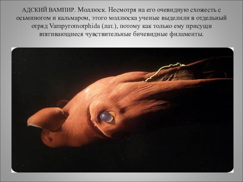 Слайд 23АДСКИЙ ВАМПИР. Моллюск. Несмотря на его очевидную схожесть с осьминогом и