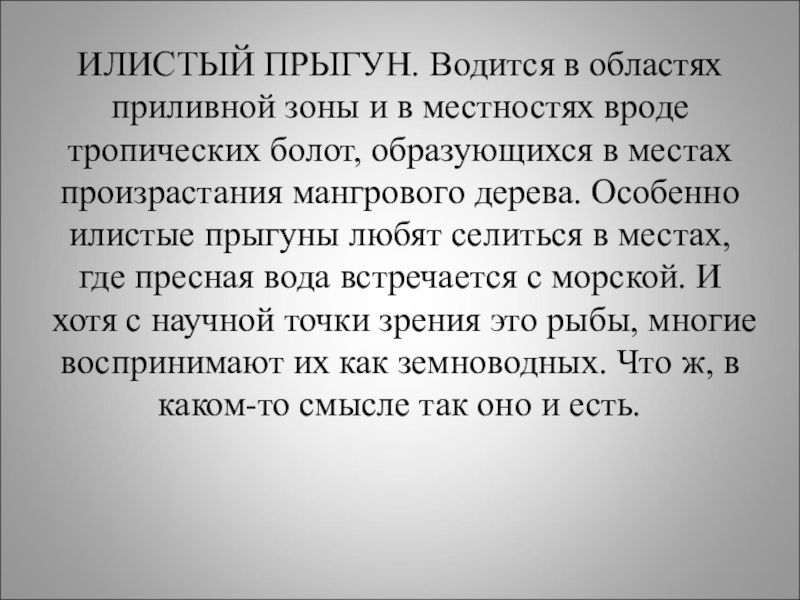 тропических болот, образующихся в местах произрастания мангрового дерева. Особенно илистые прыгуны любят селиться в местах, где пресная вода встречается с морской. И хотя с научной точки зрения это рыбы, многие воспринимают их как земноводных. Что ж, в каком-то смысле так оно и есть.